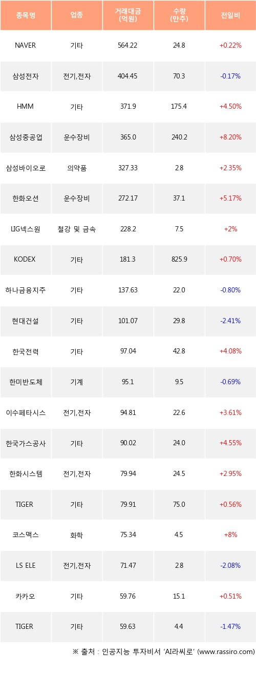 NAVER, HMM, 삼성중공업 등은 전일 대비 주가가 상승했고, 삼성전자, 하나금융지주, 현대건설 등은 주가가 하락했다.
