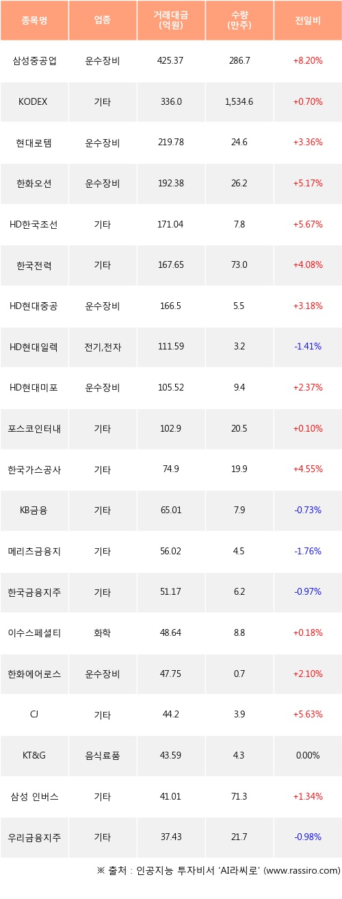 삼성중공업, KODEX 200선물인버스2X, 현대로템 등은 전일 대비 주가가 상승했고, HD현대일렉트릭, KB금융, 메리츠금융지주 등은 주가가 하락했다.