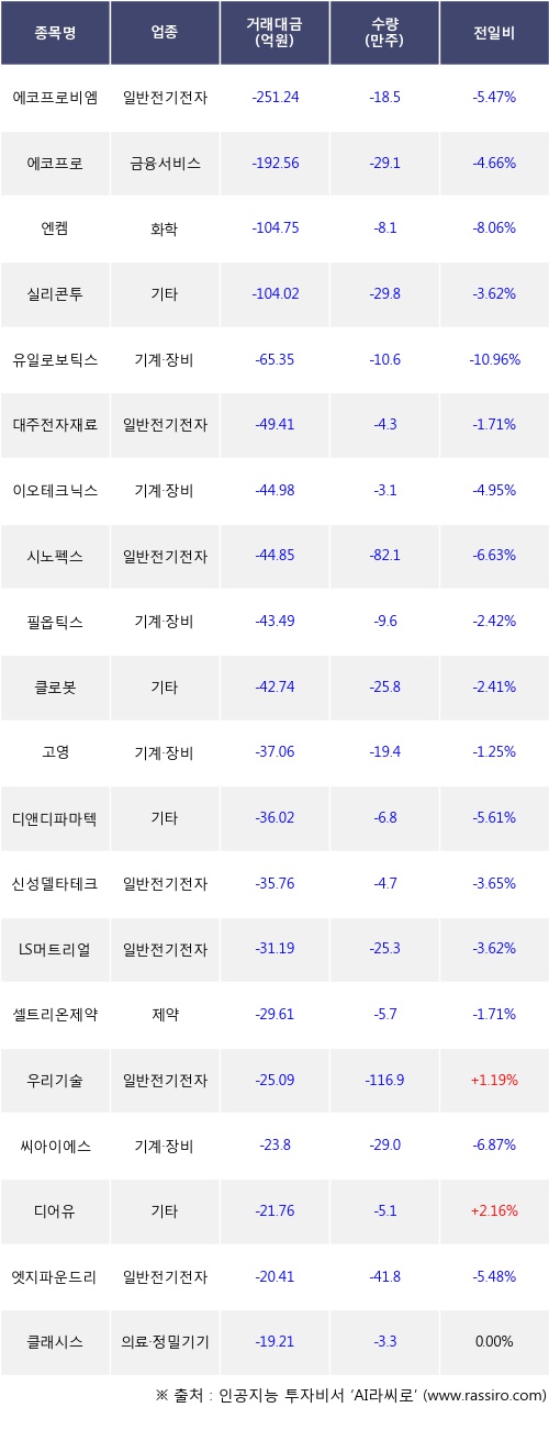 외국인 투자자의 순매도 상위 20개 종목은 에코프로비엠, 에코프로, 엔켐, 실리콘투, 유일로보틱스, 대주전자재료, 이오테크닉스, 시노펙스, 필옵틱스, 클로봇등이다.