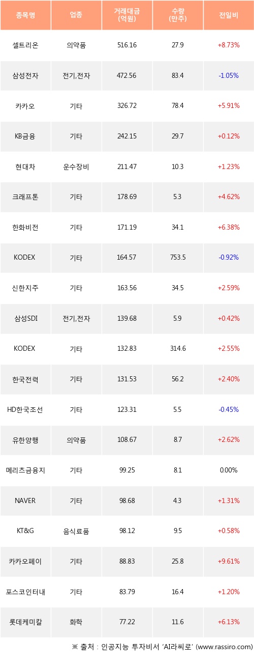 셀트리온, 카카오, KB금융 등은 전일 대비 주가가 상승했고, 삼성전자, KODEX 200선물인버스2X, HD한국조선해양 등은 주가가 하락했다.