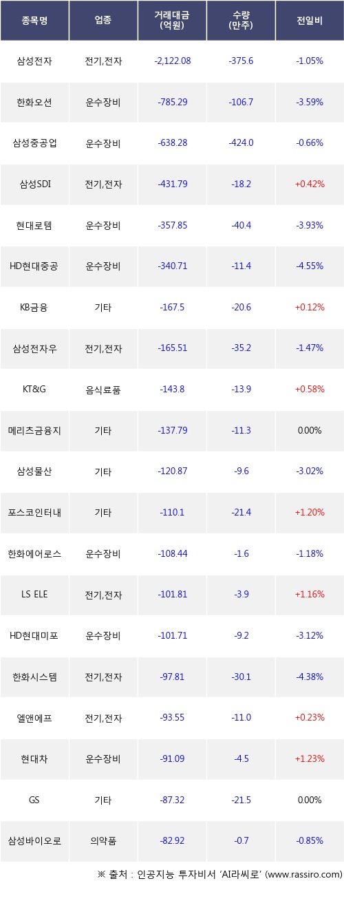 외국인 투자자의 순매도 상위 20개 종목은 삼성전자, 한화오션, 삼성중공업, 삼성SDI, 현대로템, HD현대중공업, KB금융, 삼성전자우, KT&G, 메리츠금융지주등이다.