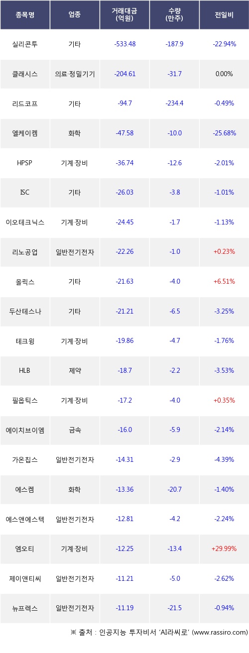 기관 투자자의 순매도 상위 20개 종목은 실리콘투, 클래시스, 리드코프, 엘케이켐, HPSP, ISC, 이오테크닉스, 리노공업, 올릭스, 두산테스나등이다.