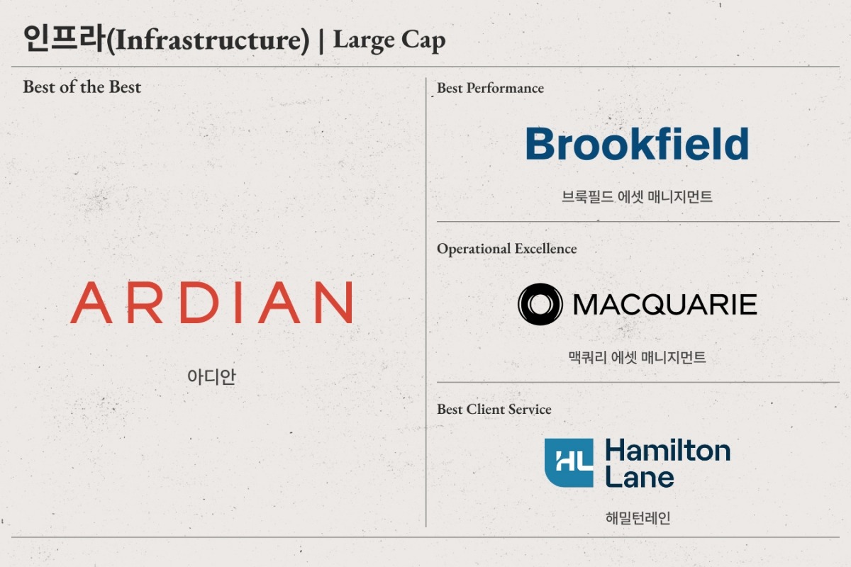 아디안(Ardian)은 대형 인프라 투자 부문에서 최고의 운용사로 평가받아 베스트 오브 베스트 수상을 안았다. 글로벌 자산 1,760억 달러를 운용 또는 자문하는 이 회사는 지난해 인프라 투자 부문에서 베스트 고객 서비스상을 수상한 바 있다. 전 세계 19개 도시에 사무소를 두고 인프라뿐만 아니라 펀드 오브 펀드(FoF), 사모 대출, 부동산 등 다양한 분야에 투자하고 있다.