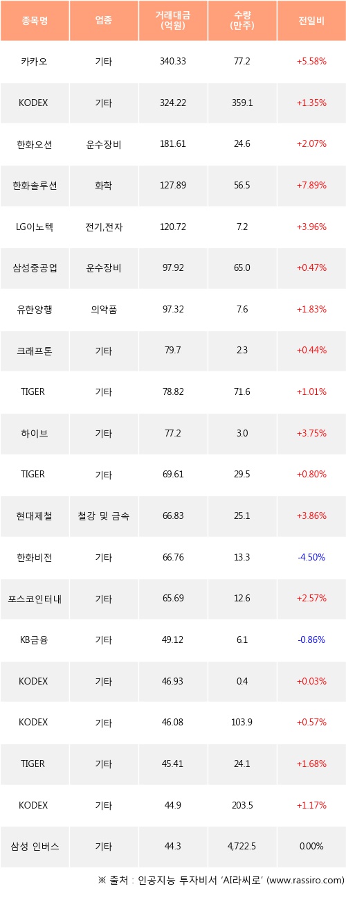 카카오, KODEX 코스닥150레버리지, 한화오션 등은 전일 대비 주가가 상승했고, 한화비전, KB금융 등은 주가가 하락했다.