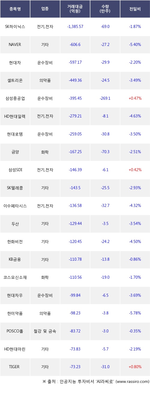 외국인 투자자의 순매도 상위 20개 종목은 SK하이닉스, NAVER, 현대차, 셀트리온, 삼성중공업, HD현대일렉트릭, 현대로템, 금양, 삼성SDI, SK텔레콤등이다.