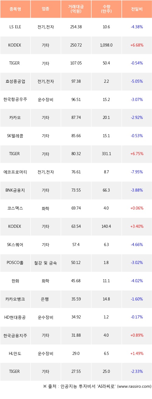 외국인 투자자의 순매수 상위 20개 종목은 LS ELECTRIC, KODEX 200선물인버스2X, TIGER 미국S&P500, 효성중공업, 한국항공우주, 카카오, SK텔레콤, TIGER 200선물인버스2X, 에코프로머티, BNK금융지주등이다.
