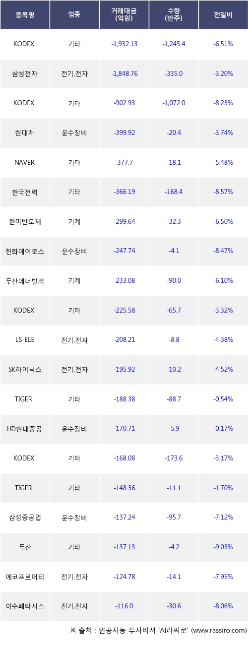 이날 기관 투자자가 순매도한 종목들 중에 KODEX 레버리지, 삼성전자, KODEX 코스닥150레버리지 등은 전일 대비 주가가 하락했다.