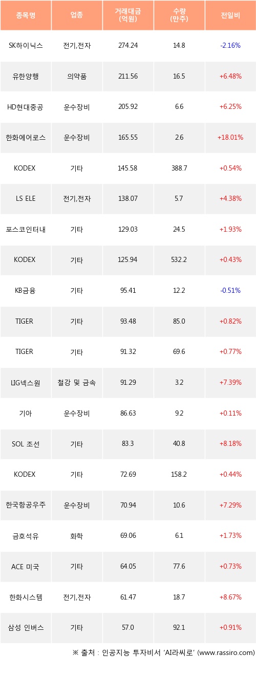 유한양행, HD현대중공업, 한화에어로스페이스 등은 전일 대비 주가가 상승했고, SK하이닉스, KB금융 등은 주가가 하락했다.
