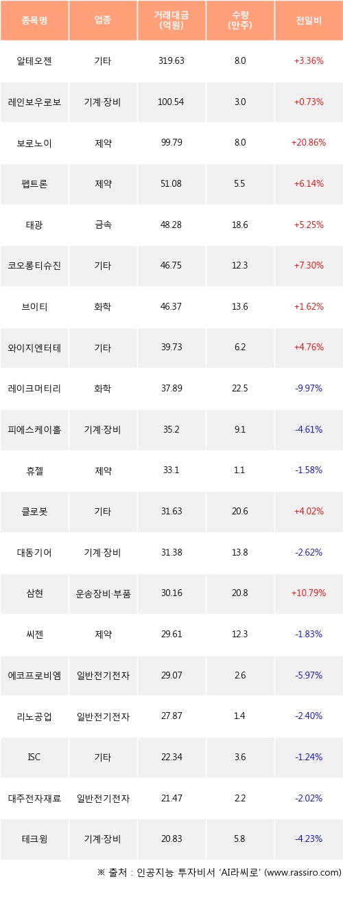알테오젠, 레인보우로보틱스, 보로노이 등은 전일 대비 주가가 상승했고, 레이크머티리얼즈, 피에스케이홀딩스, 휴젤 등은 주가가 하락했다.