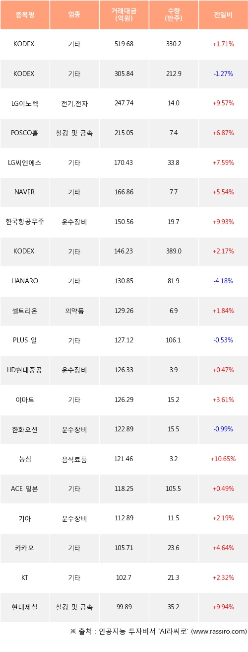기관 투자자의 순매수 상위 20개 종목은 KODEX 레버리지, KODEX K-로봇액티브, LG이노텍, POSCO홀딩스, LG씨엔에스, NAVER, 한국항공우주, KODEX 코스닥150선물인버스, HANARO CAPEX설비투자iSelect, 셀트리온등이다.
