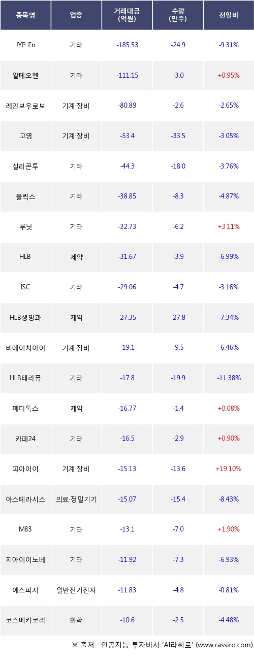기관 투자자의 순매도 상위 20개 종목은 JYP Ent., 알테오젠, 레인보우로보틱스, 고영, 실리콘투, 올릭스, 루닛, HLB, ISC, HLB생명과학등이다.
