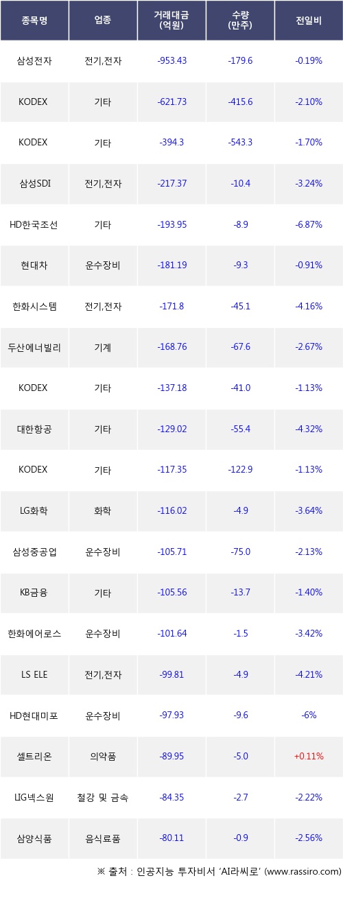 기관 투자자의 순매도 상위 20개 종목은 삼성전자, KODEX 레버리지, KODEX 코스닥150레버리지, 삼성SDI, HD한국조선해양, 현대차, 한화시스템, 두산에너빌리티, KODEX 200, 대한항공등이다.