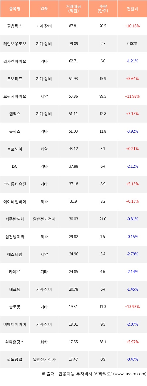 외국인 투자자의 순매수 상위 20개 종목은 필옵틱스, 레인보우로보틱스, 리가켐바이오, 로보티즈, 브릿지바이오테라퓨틱스, 젬백스, 올릭스, 보로노이, ISC, 코오롱티슈진등이다.