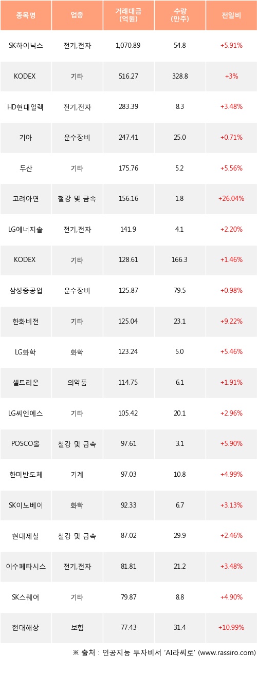 기관 투자자의 순매수 상위 20개 종목은 SK하이닉스, KODEX 레버리지, HD현대일렉트릭, 기아, 두산, 고려아연, LG에너지솔루션, KODEX 코스닥150레버리지, 삼성중공업, 한화비전등이다.