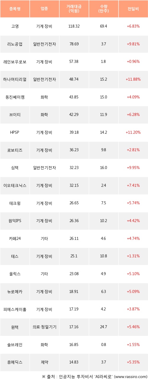 기관 투자자의 순매수 상위 20개 종목은 고영, 리노공업, 레인보우로보틱스, 하나머티리얼즈, 동진쎄미켐, 브이티, HPSP, 로보티즈, 심텍, 이오테크닉스등이다.