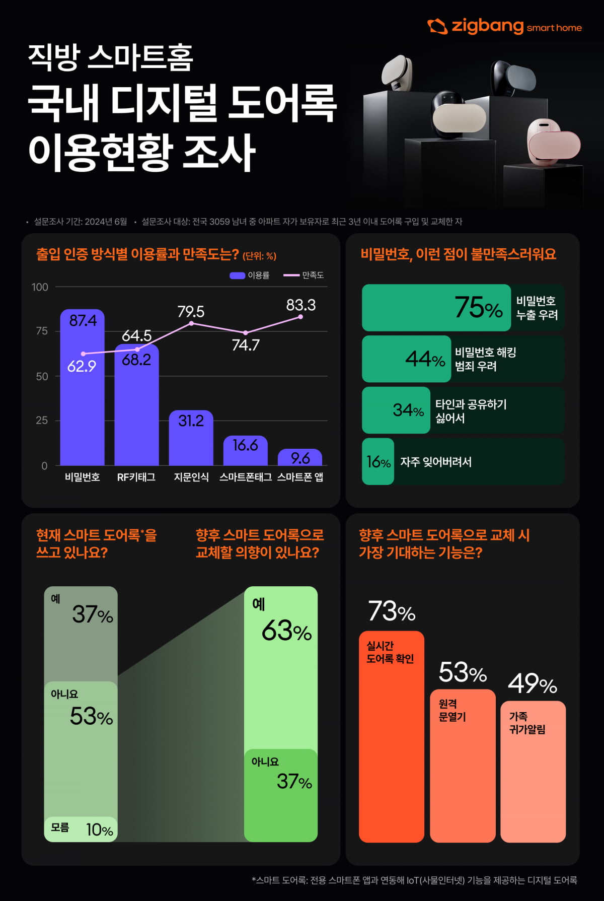 이번 조사는 지난해 6월 직방은 전문조사기관과 함께 전국에 거주하는 30~59세 남녀 중 아파트 자가 보유자로 최근 3년 이내 디지털 도어록을 구입 및 교체한 경험이 있는 500명을 대상으로 진행했다.