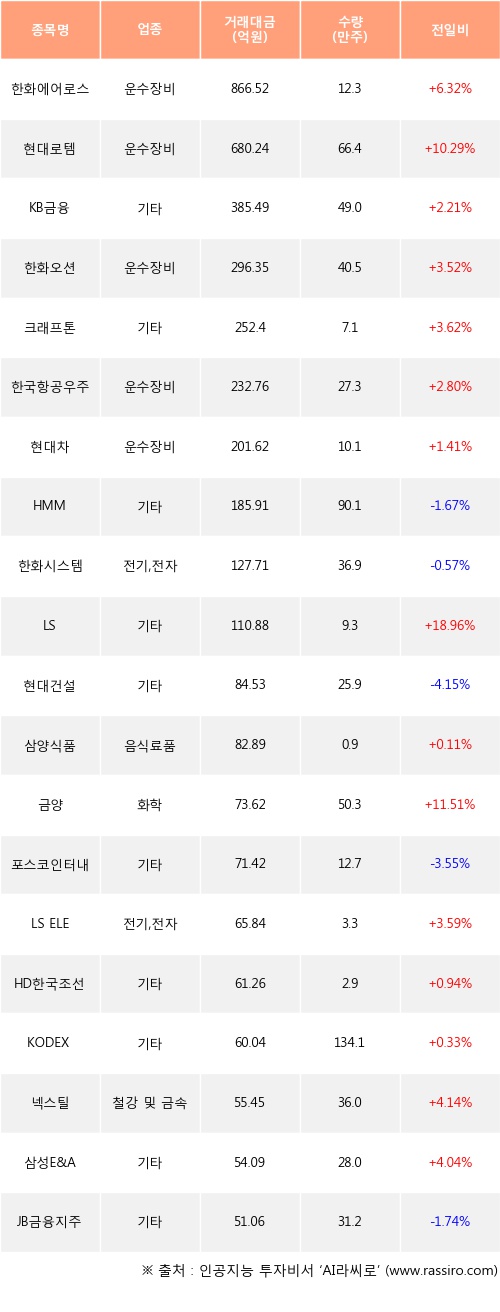 외국인 투자자의 순매수 상위 20개 종목은 한화에어로스페이스, 현대로템, KB금융, 한화오션, 크래프톤, 한국항공우주, 현대차, HMM, 한화시스템, LS등이다.