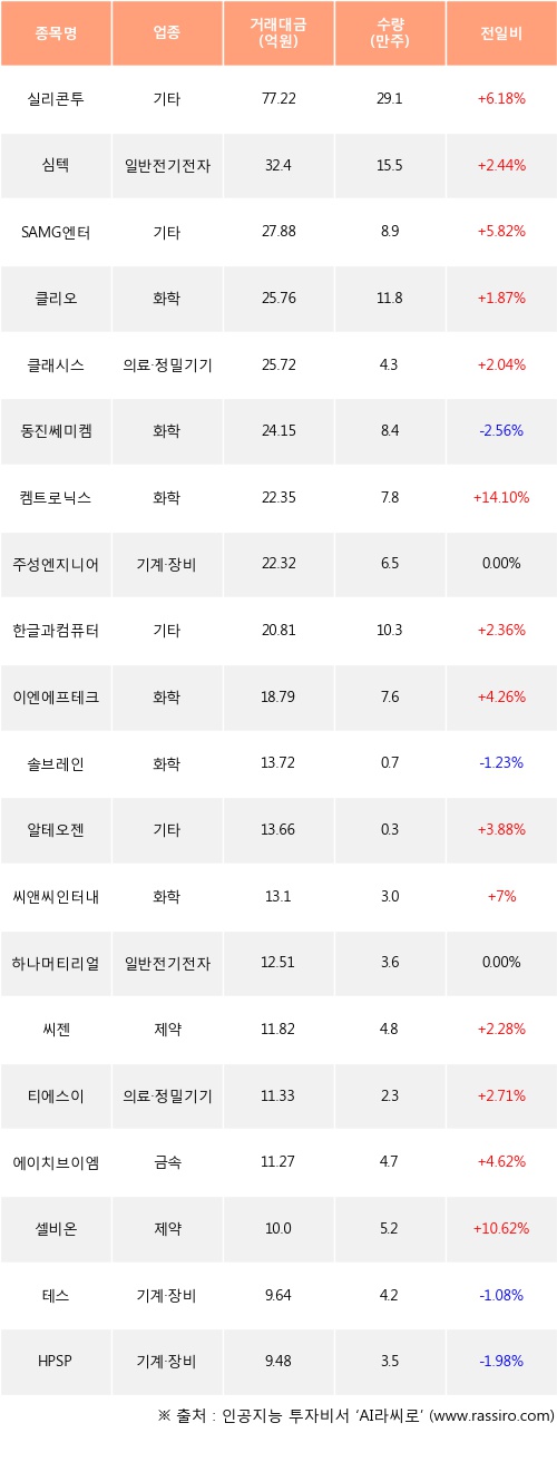 실리콘투, 심텍, SAMG엔터 등은 전일 대비 주가가 상승했고, 동진쎄미켐, 솔브레인, 테스 등은 주가가 하락했다.