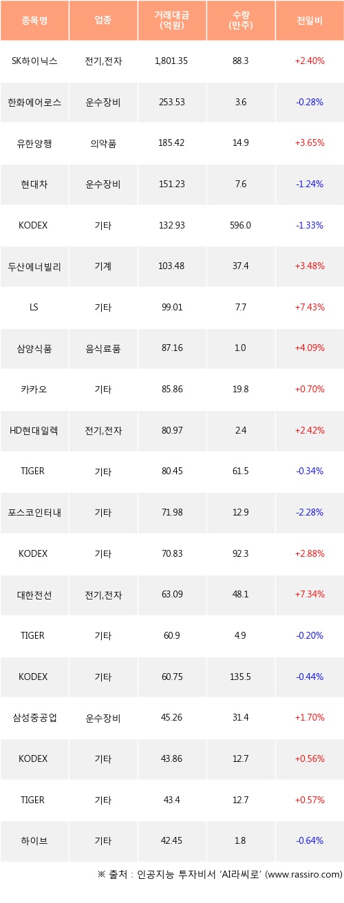 외국인 투자자의 순매수 상위 20개 종목은 SK하이닉스, 한화에어로스페이스, 유한양행, 현대차, KODEX 200선물인버스2X, 두산에너빌리티, LS, 삼양식품, 카카오, HD현대일렉트릭등이다.