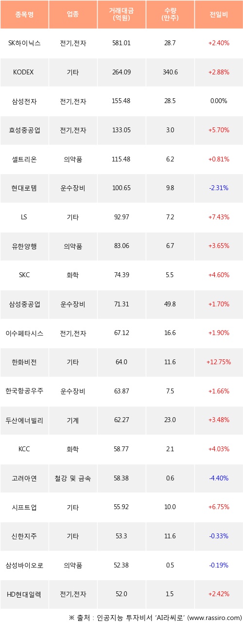 SK하이닉스, KODEX 코스닥150레버리지, 효성중공업 등은 전일 대비 주가가 상승했고, 현대로템, 고려아연, 신한지주 등은 주가가 하락했다.