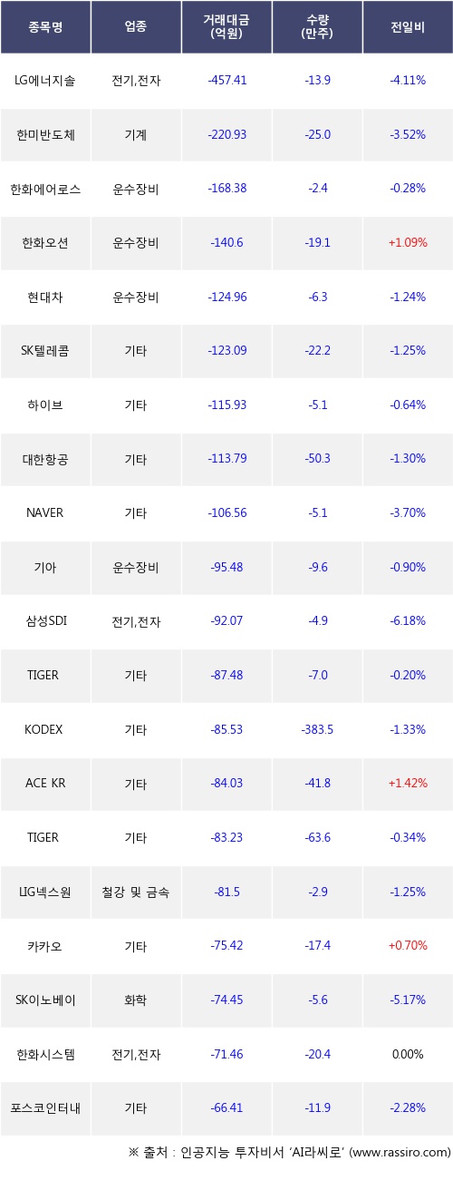 기관 투자자의 순매도 상위 20개 종목은 LG에너지솔루션, 한미반도체, 한화에어로스페이스, 한화오션, 현대차, SK텔레콤, 하이브, 대한항공, NAVER, 기아등이다.