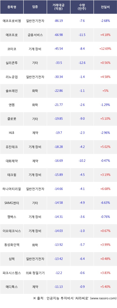 외국인 투자자의 순매도 상위 20개 종목은 에코프로비엠, 에코프로, 코미코, 실리콘투, 리노공업, 솔브레인, 엔켐, 클로봇, HLB, 유진테크등이다.