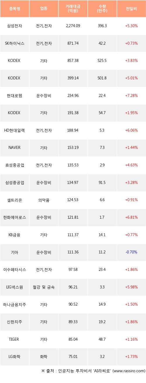 삼성전자, SK하이닉스, KODEX 레버리지 등은 전일 대비 주가가 상승했고, 기아 등은 주가가 하락했다.