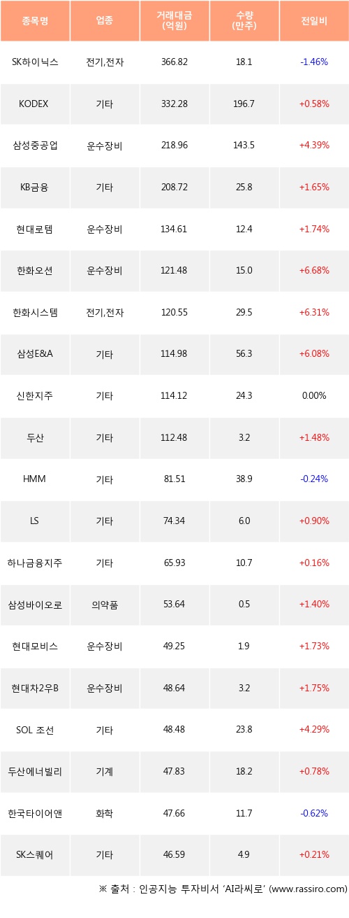 기관 투자자의 순매수 상위 20개 종목은 SK하이닉스, KODEX 레버리지, 삼성중공업, KB금융, 현대로템, 한화오션, 한화시스템, 삼성E&A, 신한지주, 두산등이다.