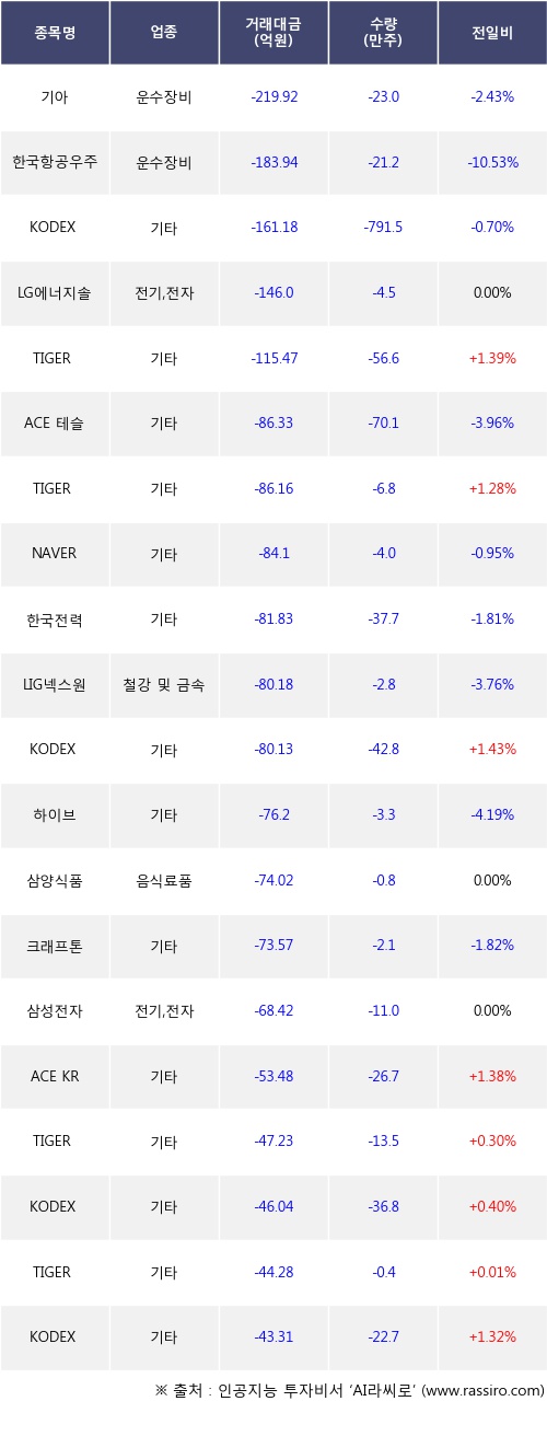 기관 투자자의 순매도 상위 20개 종목은 기아, 한국항공우주, KODEX 200선물인버스2X, LG에너지솔루션, TIGER 미국S&P500, ACE 테슬라밸류체인액티브, TIGER 미국나스닥100, NAVER, 한국전력, LIG넥스원등이다.