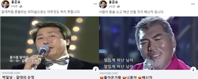 홍 시장은 이어 나훈아의 배신자 유튜브 영상을 올리면서 "사람의 탈을 쓰고 해선 안 될 짓이 배신자"라고 적기도 했다.