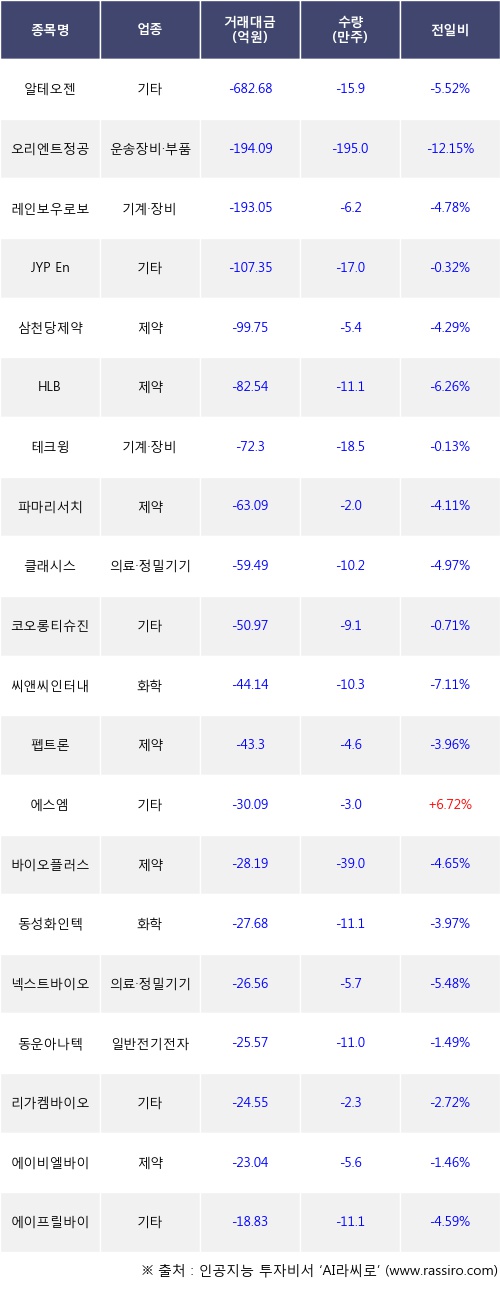 외국인 투자자의 순매도 상위 20개 종목은 알테오젠, 오리엔트정공, 레인보우로보틱스, JYP Ent., 삼천당제약, HLB, 테크윙, 파마리서치, 클래시스, 코오롱티슈진등이다.