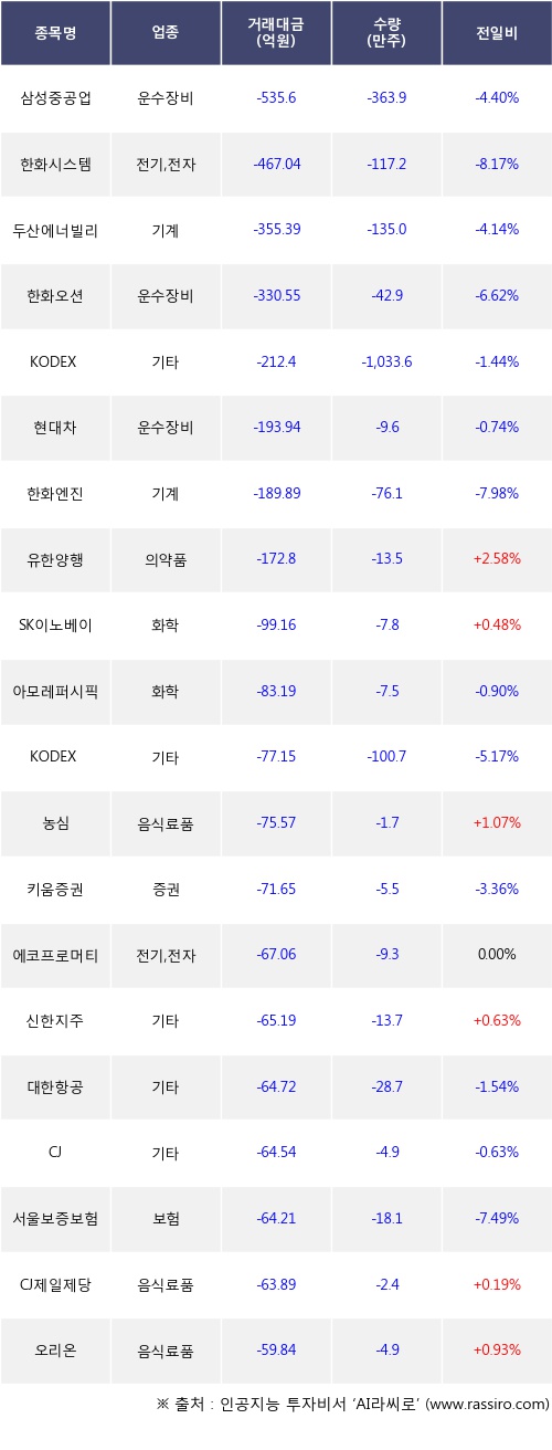 외국인 투자자의 순매도 상위 20개 종목은 삼성중공업, 한화시스템, 두산에너빌리티, 한화오션, KODEX 200선물인버스2X, 현대차, 한화엔진, 유한양행, SK이노베이션, 아모레퍼시픽등이다.