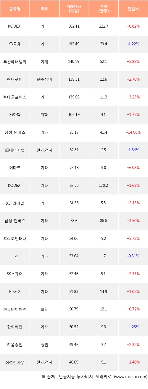 KODEX 레버리지, 두산에너빌리티, 현대로템 등은 전일 대비 주가가 상승했고, KB금융, LG에너지솔루션, 두산 등은 주가가 하락했다.