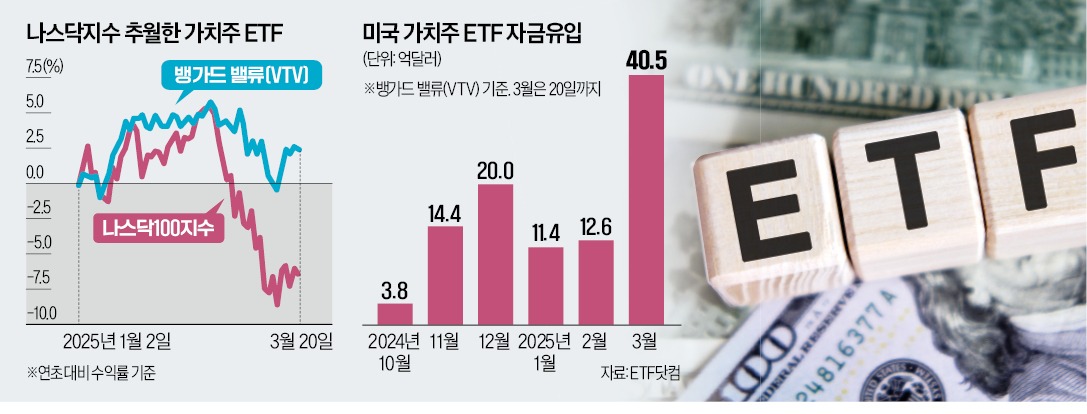 가치주 ETF에 뭉칫돈이 몰린 것은 시장이 급락하는 와중에도 높은 주가 방어력을 보여줬기 때문이다. VTV는 벅셔해서웨이 클래스B, JP모간체이스, 엑슨모빌 등 주요 가치주에 투자하는 ETF로, 올 들어 이달 20일까지 2.43% 올랐다. 같은 기간 S&P500지수(-3.7%), 나스닥100지수(-6.4%)는 하락했다.
