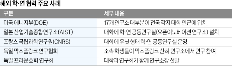 해외 주요국은 연구개발(R&D) 성과 극대화와 우수 연구인재 양성을 위한 연구기관 간 개방적인 지식교류·협력이 활발하게 진행 중이다. 프랑스의 정부 출연연인 국립과학연구센터(CNRS)는 연구부서 90% 이상이 대학 등 연구기관과의 공동연구실(UMR)을 대학 내외에 운영하고 있다. 독일 전역에 76개 연구소를 운영 중인 유럽 최대 응용과학 연구소 프라운호퍼는 대부분의 연구소장이 대학교수를 겸직하며, 학·연 간 다양한 인력교류 프로그램을 통해 인재 배출의 요람으로 자리 잡았다.