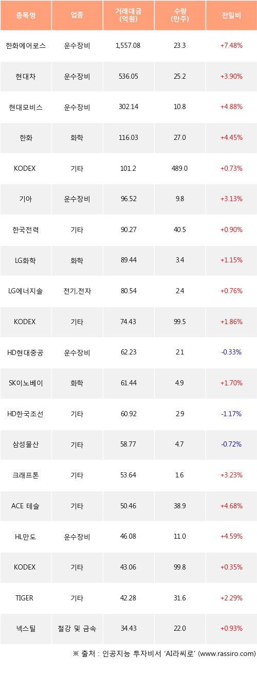 외국인 투자자의 순매수 상위 20개 종목은 한화에어로스페이스, 현대차, 현대모비스, 한화, KODEX 200선물인버스2X, 기아, 한국전력, LG화학, LG에너지솔루션, KODEX 코스닥150레버리지등이다.