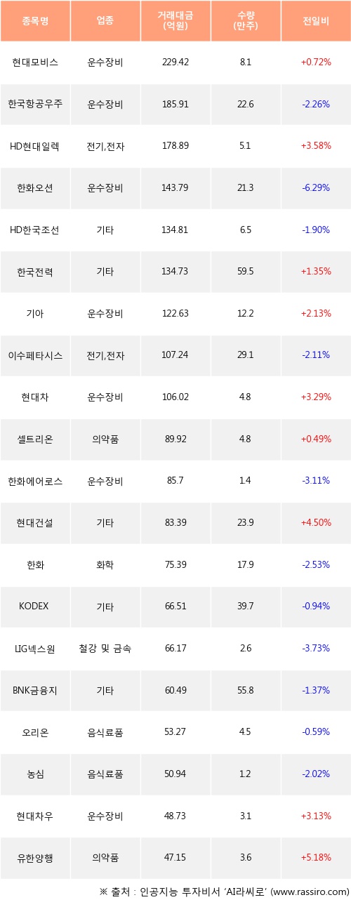 현대모비스, HD현대일렉트릭, 한국전력 등은 전일 대비 주가가 상승했고, 한국항공우주, 한화오션, HD한국조선해양 등은 주가가 하락했다.