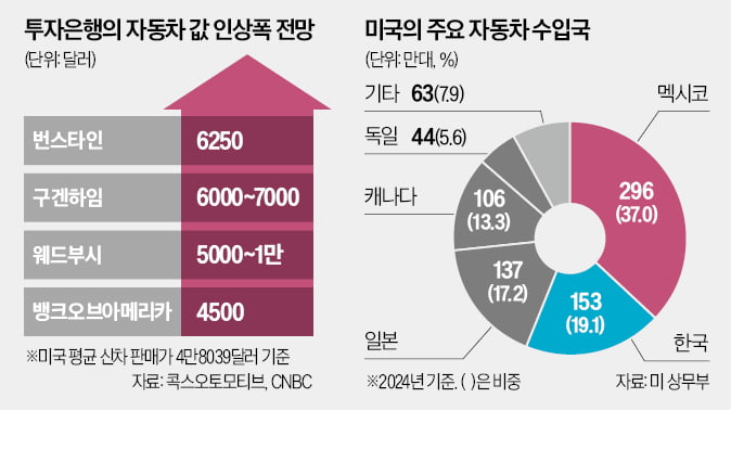 번스타인은 이번 수입차·부품 관세로 미국의 평균 신차 가격이 대당 6250달러(약 910만원) 상승할 것으로 분석했다. 전날 도널드 트럼프 대통령이 발표한 예상 관세 세수 1000억달러를 지난해 미국 판매 차량 대수인 1600만 대로 나눈 결과다. 골드만삭스는 수입차 가격이 대당 5000~1만5000달러, 국내 차량가는 부품 관세 등으로 최대 8000달러 오를 수 있다고 진단했다. 지난달 미국 평균 신차 가격은 약 4만8000달러다.