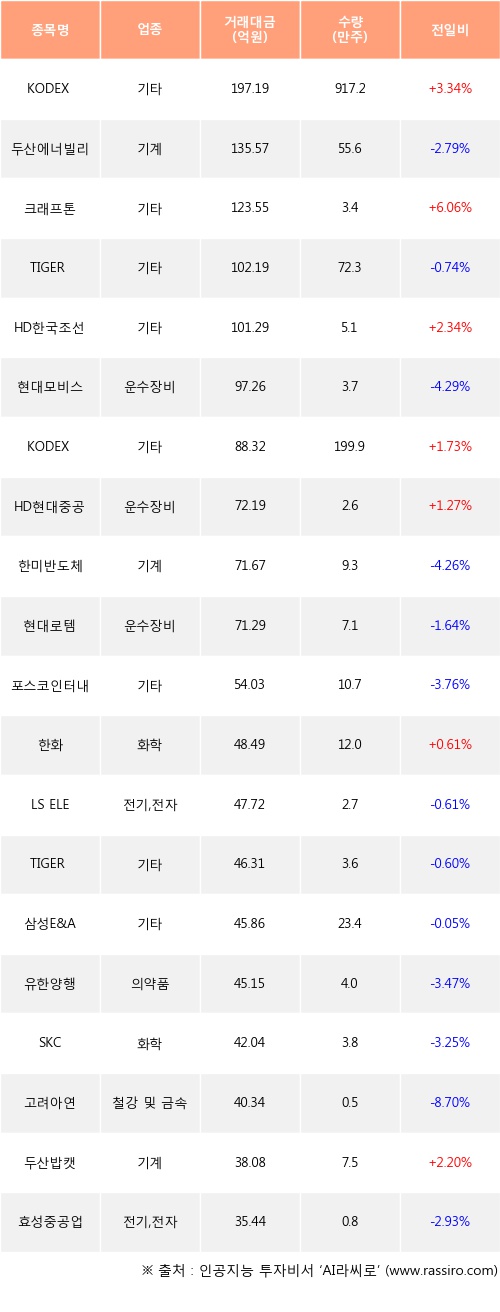 KODEX 200선물인버스2X, 크래프톤, HD한국조선해양 등은 전일 대비 주가가 상승했고, 두산에너빌리티, TIGER 은행고배당플러스TOP10, 현대모비스 등은 주가가 하락했다.