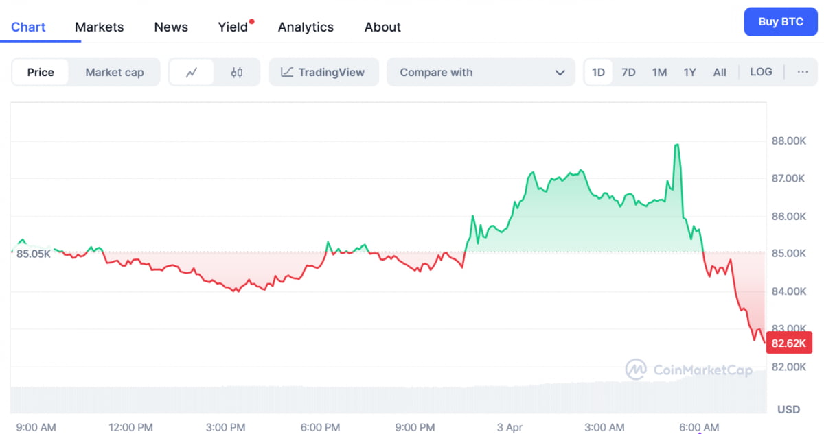 트럼프 행정부가 발표한 '관세 폭탄'에 비트코인도 약세를 보이고 있다.