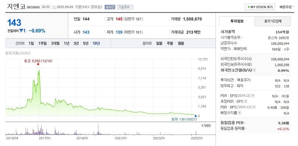 당시 한반도 대운하 테마주로 인식되며 대선일 12월 19일을 앞두고 7월 940원 ‘동전주’였던 이 회사의 주가는 4대강 사업 기대감에 2만5543원(유상증자 가격 등 반영)까지 치솟았다. 당시 대우건설, 현대건설, GS건설 등 내로라하는 건설사보다 시가총액이 높았다. 하지만 5일 주가는 1616원으로 거래정지 상태고 시가총액은 360억원에 그친다.