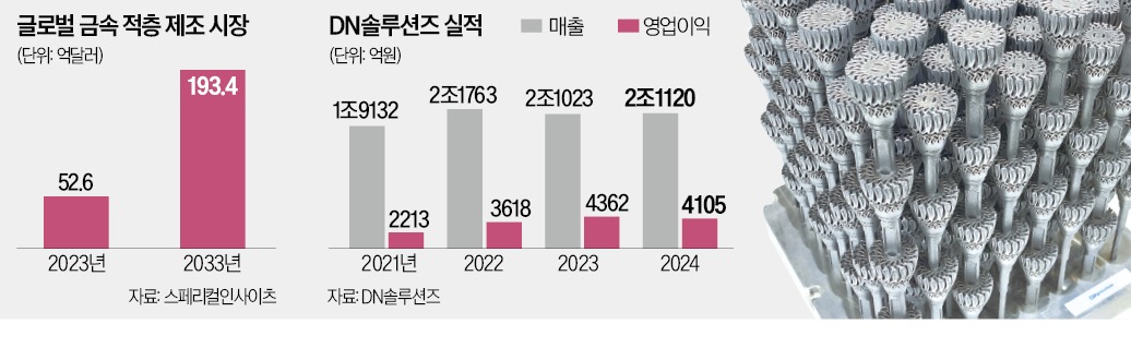 DN솔루션즈는 올 3월 인도 최대 금속 적층제조 장비 업체인 인텍에 지분을 투자하고 전략적 파트너십을 체결하는 등 적층제조 역량을 강화해 왔다. 시장조사업체 스페리컬인사이츠는 글로벌 금속 적층제조 시장이 2023년 52억6000달러(약 8조원)에서 2033년 193억4000만달러(약 29조원)로 연평균 14%대 성장세를 보일 것으로 예상했다.