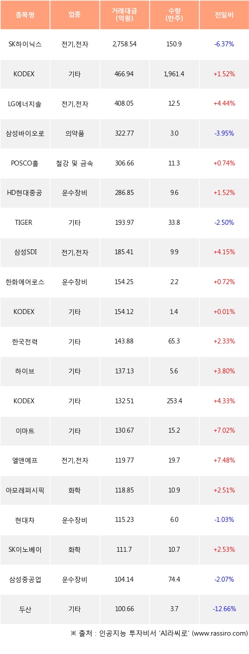기관 투자자의 순매수 상위 20개 종목은 SK하이닉스, KODEX 200선물인버스2X, LG에너지솔루션, 삼성바이오로직스, POSCO홀딩스, HD현대중공업, TIGER 미국S&P500선물(H), 삼성SDI, 한화에어로스페이스, KODEX CD금리액티브(합성)등이다.