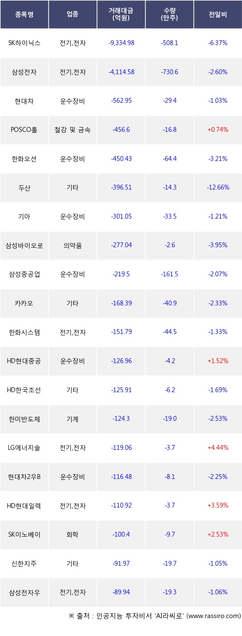 외국인 투자자의 순매도 상위 20개 종목은 SK하이닉스, 삼성전자, 현대차, POSCO홀딩스, 한화오션, 두산, 기아, 삼성바이오로직스, 삼성중공업, 카카오등이다.
