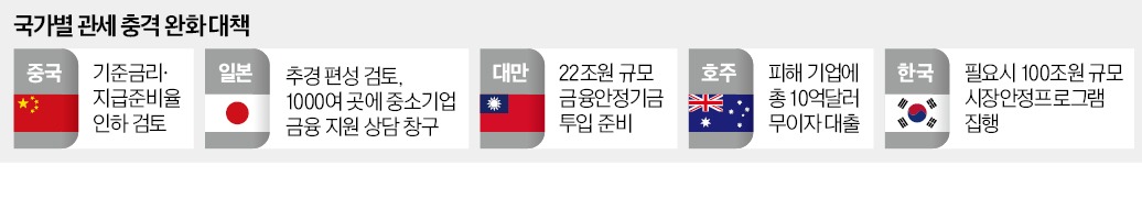 대만도 시장 충격을 최소화하기 위한 대책을 꺼낼 태세다. 연합보 등 대만 매체에 따르면 줘룽타이 대만 행정원장(한국의 국무총리 격)은 5일 중앙은행장과 재무장관 등이 참여하는 고위급 회의에서 “마음의 준비를 하고 (시장) 충격에 대비해야 한다”고 했다. 대만 연합보는 이날 회의에서 5000억대만달러(약 22조원) 규모의 국가금융안정기금 투입 가능성을 시사했다. 대만은 미국으로부터 32%의 상호관세를 부과받았다.
