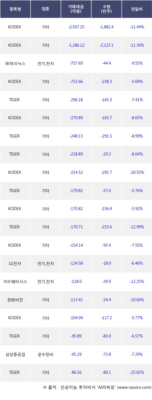 이날 기관 투자자가 순매도한 종목들 중에 KODEX 레버리지, KODEX 코스닥150레버리지, SK하이닉스 등은 전일 대비 주가가 하락했다.