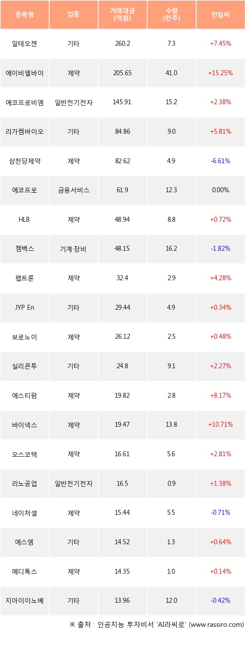 알테오젠, 에이비엘바이오, 에코프로비엠 등은 전일 대비 주가가 상승했고, 삼천당제약, 젬백스, 네이처셀 등은 주가가 하락했다.