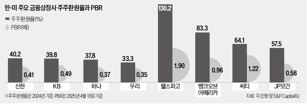 하지만 미국 주요 금융사와의 격차는 더 벌어진 것으로 파악됐다. 미국 주요 대형 은행이 3년 만에 최대치인 150조원에 달하는 대규모 주주환원에 나서면서다. 글로벌 금융정보업체 S&P캐피털IQ에 따르면 JP모간, 뱅크오브아메리카, 씨티, 웰스파고 등 4곳의 작년 평균 주주환원율은 83.8%에 달했다. 배당금 등을 대폭 늘린 웰스파고는 작년 주주환원율이 130.2%였다. 업계에선 “미국 주요 금융사가 호실적을 바탕으로 트럼프 정부의 규제 완화 기대에 대대적인 주주환원에 나선 것”이라며 “국내 금융지주들이 2027년 50% 수준의 주주환원율 달성을 목표로 제시했지만, 해외 투자자의 눈높이를 맞추기엔 역부족인 상황”이라고 평가했다.