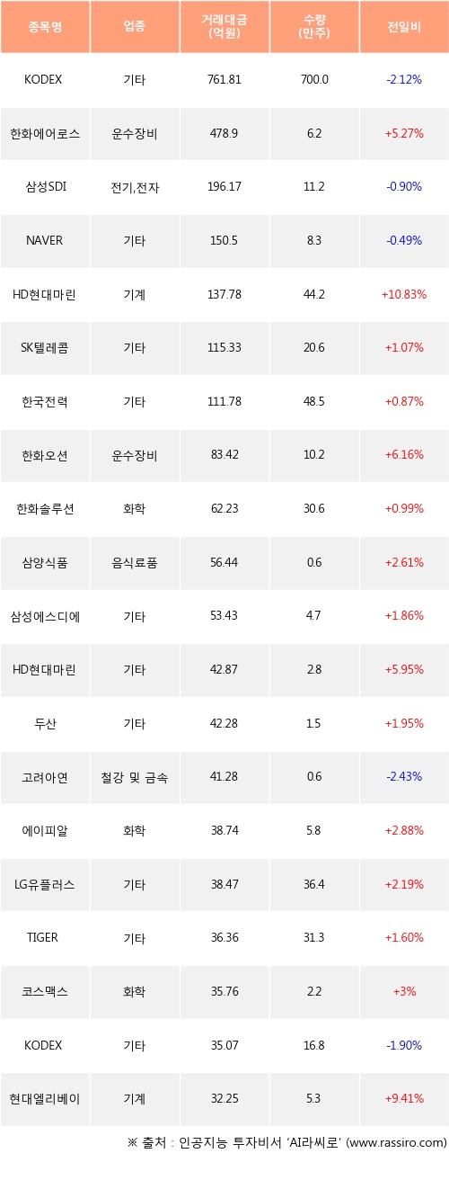 한화에어로스페이스, HD현대마린엔진, SK텔레콤 등은 전일 대비 주가가 상승했고, KODEX MSCI Korea TR, 삼성SDI, NAVER 등은 주가가 하락했다.