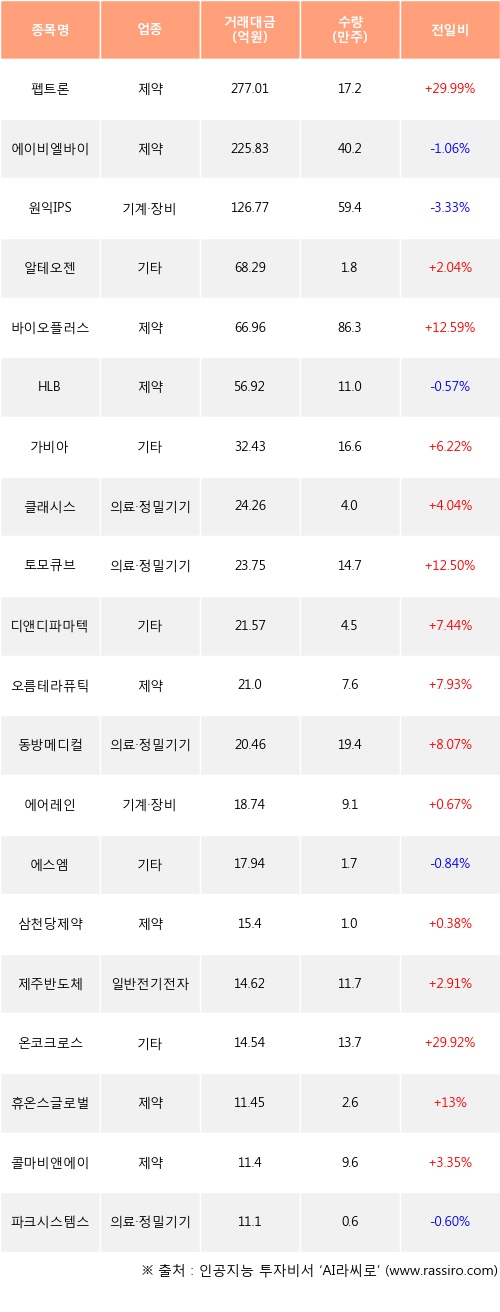펩트론, 알테오젠, 바이오플러스 등은 전일 대비 주가가 상승했고, 에이비엘바이오, 원익IPS, HLB 등은 주가가 하락했다.